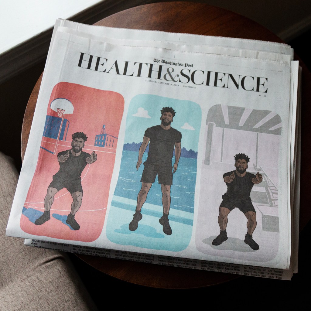 The exercise model, Louis Scott, and I met with a personal trainer to make sure the exercises were done with proper form before we started filming. I communicated with the story designers on how I envisioned the exercises be displayed on the page and edited the videos to fit into the layout.